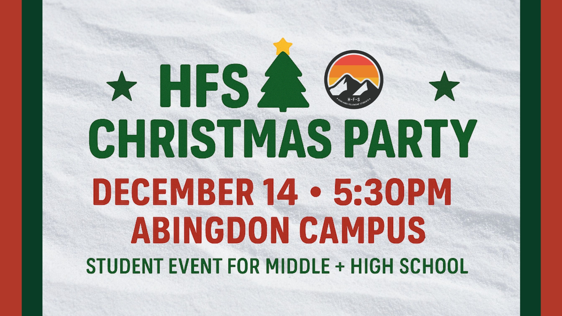 It's the most wonderful time of the year, and we're celebrating BIG! Join HFS (middle + high school) for an unforgettable Christmas party filled with fun, food, + friends.